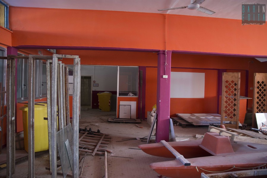 Continuiamo a camminare e ci ritroviamo sotto un porticato dove è situato ancora un lungo tavolo in legno con delle sedie. Introduce a un grande ambiente chiuso: l’ex mensa e bar. Qui lo scenario è davvero raccapricciante: sedie e tavoli ammassati gli uni sugli altri, estintori lasciati a terra, vetri, cartacce e persino un moscone che da tre anni non vede più il mare. L’unica nota positiva sono le pareti colorate arancio e viola, meno rovinate di quelle esterne, completamente ricoperte da graffiti.Notizia di proprietà della testata giornalistica © Barinedita (vietata la riproduzione)