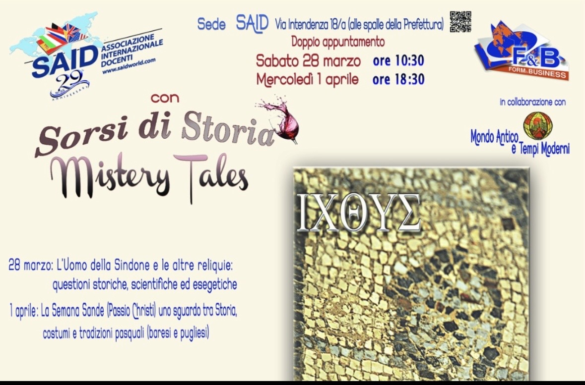 BARI - Appuntamento con la storia, Sabato 28 marzo alle 10:30 e mercoledì 1 aprile alle 18:30, la SAID, in collaborazione con Mondo Antico e Tempi Moderni, è lieta di invitarvi presso la propria sede, con prenotazione obbligatoria al numero 389-5878424 anche via WhatsApp fino ad esaurimento posti, per un doppio incontro all'insegna della storia e delle tradizioni pasquali baresi e pugliesi.