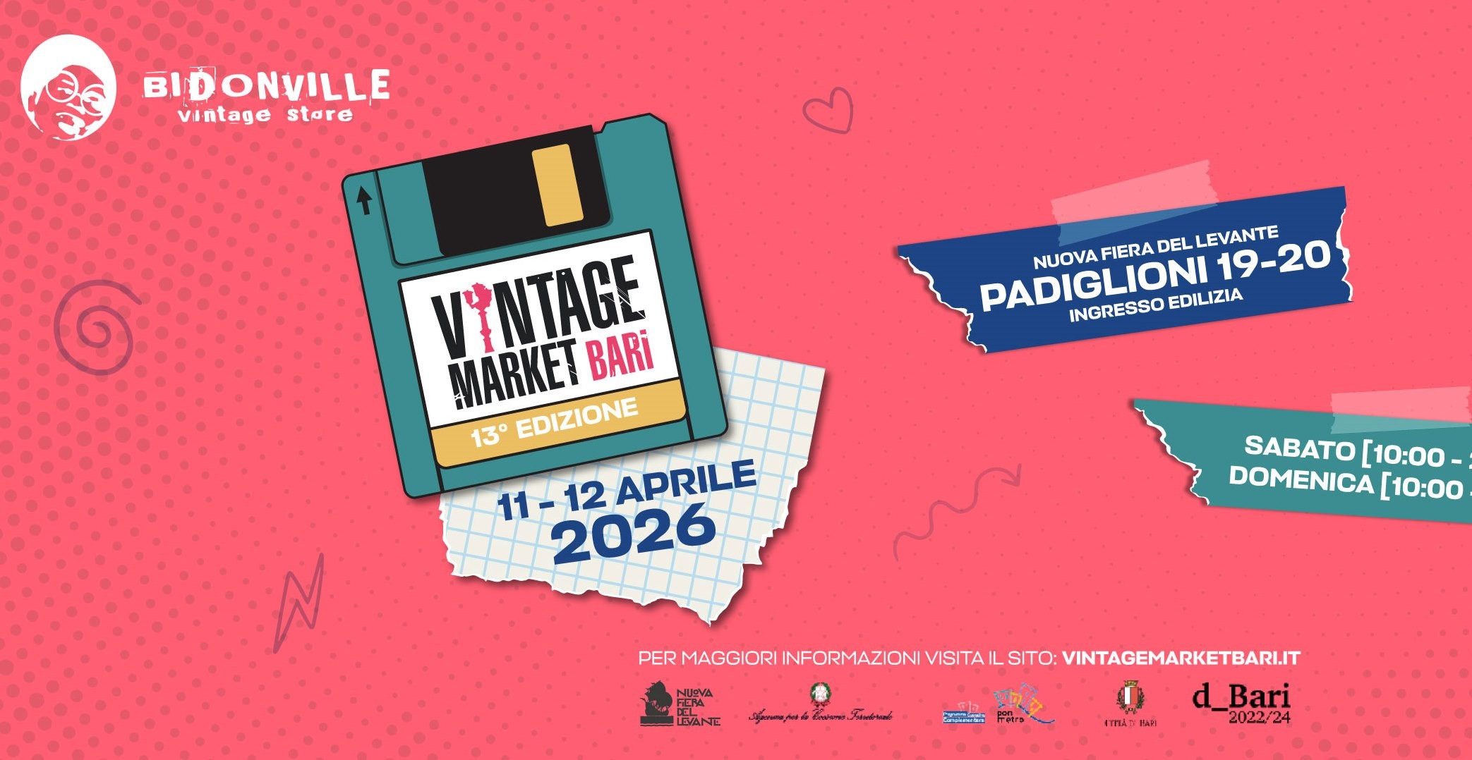 Pronta la tredicesima edizione del Vintage Market Bari, la mostra mercato di prodotti e oggetti vintage e di seconda mano più grande e prestigiosa di tutto il Mezzogiorno. Organizzata come di consueto da Bidonville Vintage Store, la manifestazione in programma sabato 11 e domenica 12 aprile nei padiglioni 19 e 20 della Fiera del Levante (ingresso Edilizia) ospiterà più di 200 espositori provenienti da molte regioni d’Italia, in uno spazio di circa 10.000 metri quadri.
