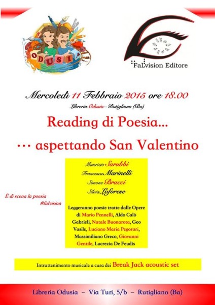 RUTIGLIANO - Mercoledì 11 febbraio alle 18.00 la libreria Odusia di Rutigliano ospita un reading di poesie dedicato alla ricorrenza di san Valentino, a cura di Maurizio Sarubbi, Francesca Marinelli, Simone Bracci e Silvia Loforese.