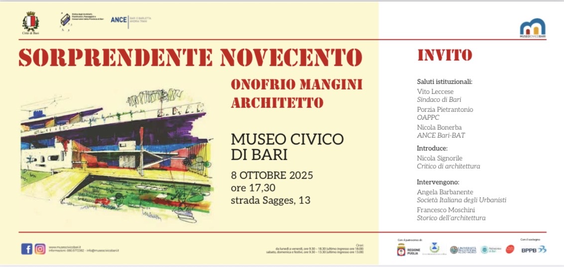 “La mostra dedicata a Onofrio Mangini risponde all’esigenza di colmare un vuoto di conoscenza diffusa sullo sviluppo urbanistico della nostra città, a partire dagli anni ’50, e di riconoscere la necessità di tutelare alcune delle opere più significative dell’architettura moderna e contemporanea presenti sul territorio cittadino - afferma il sindaco Vito Leccese -Mangini è stato infatti uno dei protagonisti indiscussi di quella generazione di architetti e progettisti che nel dopoguerra ha contribuito a cambiare il volto di Bari”.