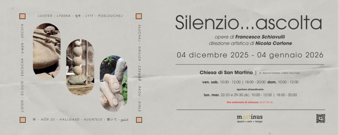 BARI - “Silenzio…ascolta” è l’evocativo titolo della mostra personale dell’artista barese Francesco Schiavulli, curata da Nicola Cortone e promossa dall’Aps Martinus, che sarà esposta nella millenaria chiesa di San Martino (strada Bianchi Dottula 4, Bari Vecchia) dal 4 dicembre 2025 al 4 gennaio 2026.