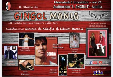 ADELFIA - Mercoledì 6 dicembre alle ore 21,00, presso l'Auditorium comunale Angiuli di Adelfia, si terrà l'evento GINGOL MANIA.