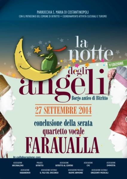 BITRITTO - Nell'ambito della quinta edizione de "La notte degli angeli", sabato 27 settembre alle 23.00 Bitritto ospita in piazza Leone un concerto del quartetto femminile vocale di musica etnica pugliese Faraualla.