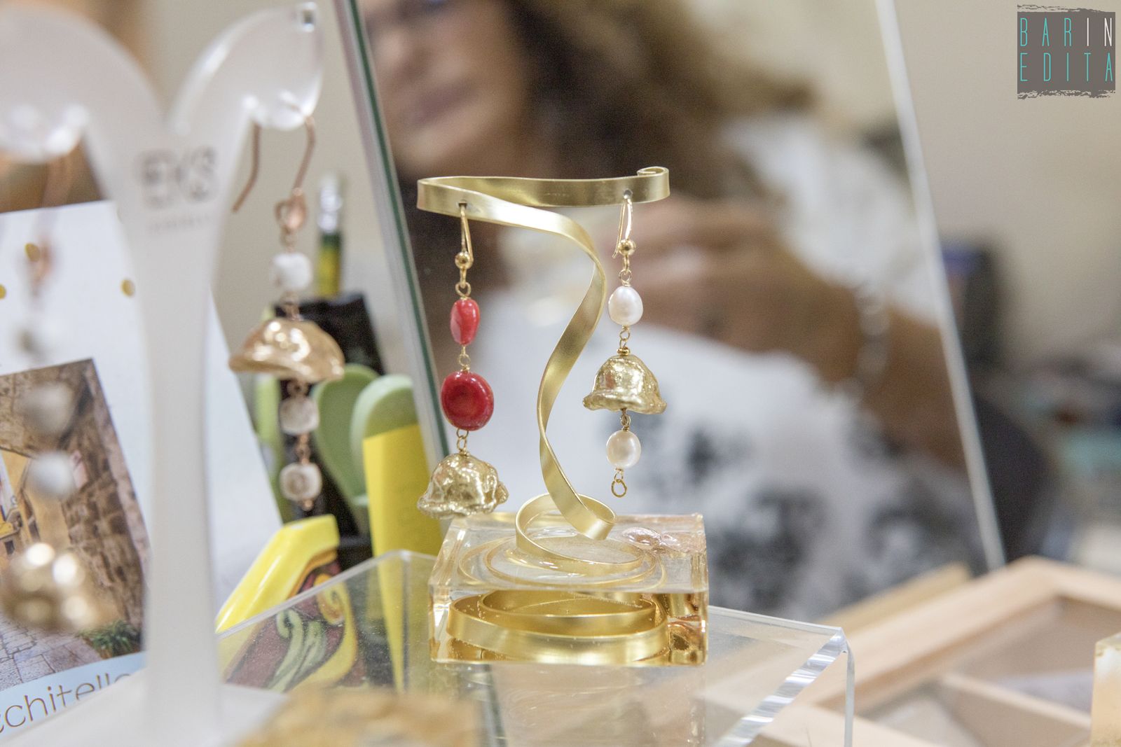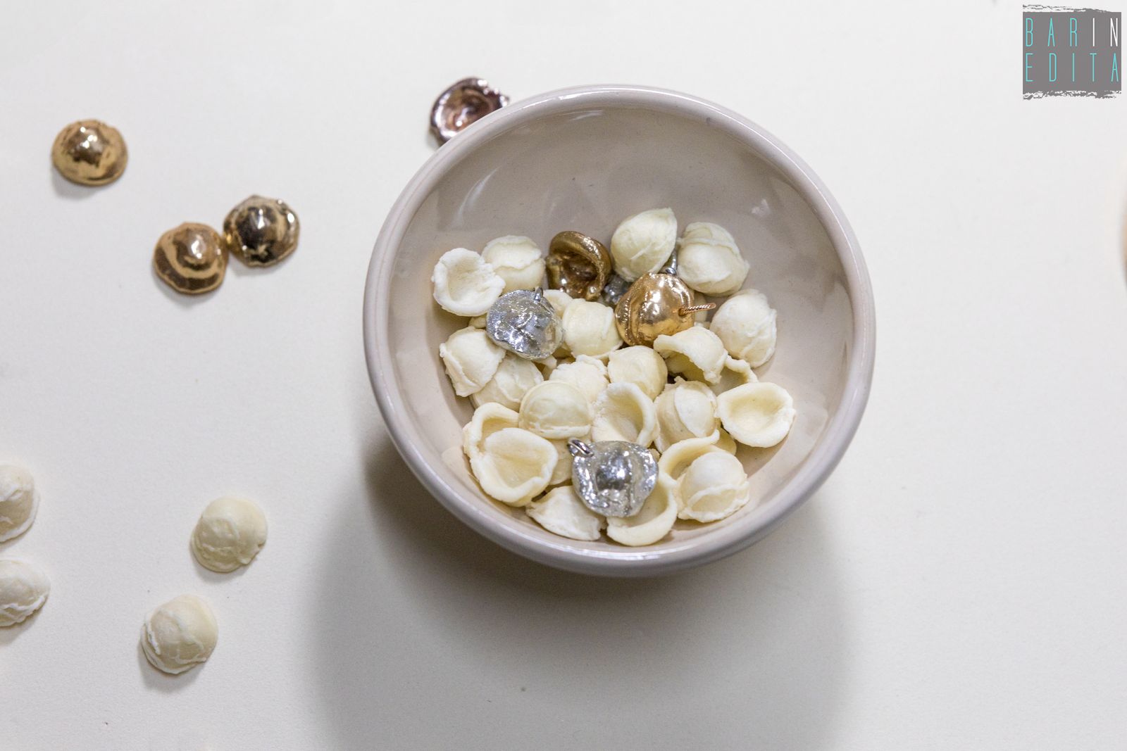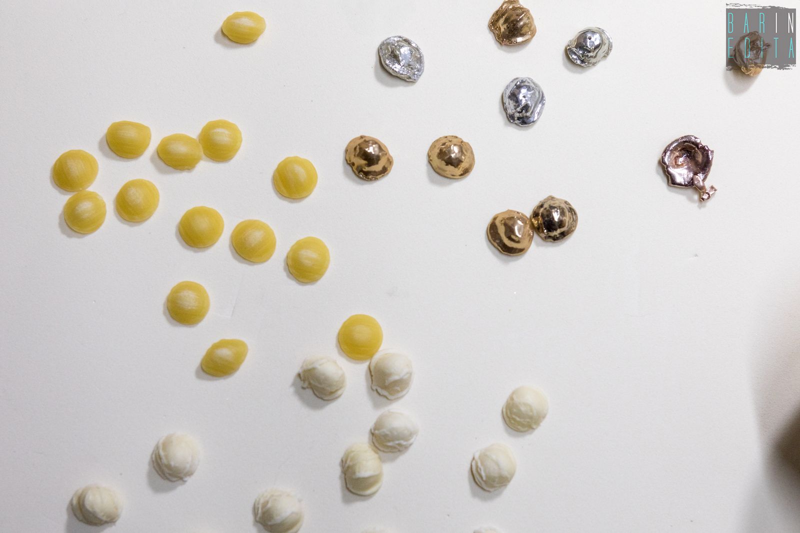 L’idea è tanto semplice quanto curiosa: utilizzare la tipica pasta barese e sottoporla a uno speciale processo di smaltatura a freddo in oro e argento. Si ottengono così orecchini, bracciali e collane che conservano la forma originale, con la stessa rugosità e le piccole imperfezioni tipiche delle orecchiette fatte a mano.