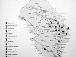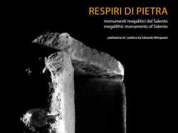 Copertina, fotografie e cartina geografica dei monumenti megalitici salentini, tratti dal volume Respiri di pietra di Leonello Bertolucci