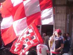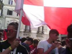 L'attesa di centinaia di tifosi davanti al portone del notaio Francesco Paolo Petrera, in via Piccinni 195, dove Gianluca Paparesta, amministratore unico della Fc Bari 1908, sta completando con i curatori Marcello Danisi e Gianvito Giannelli l’acquisizione del ramo sportivo dell'As Bari. Cori da stadio e traffico rallentato: intervenuti vigili urbani e carabinieri. (foto di Eva Signorile)