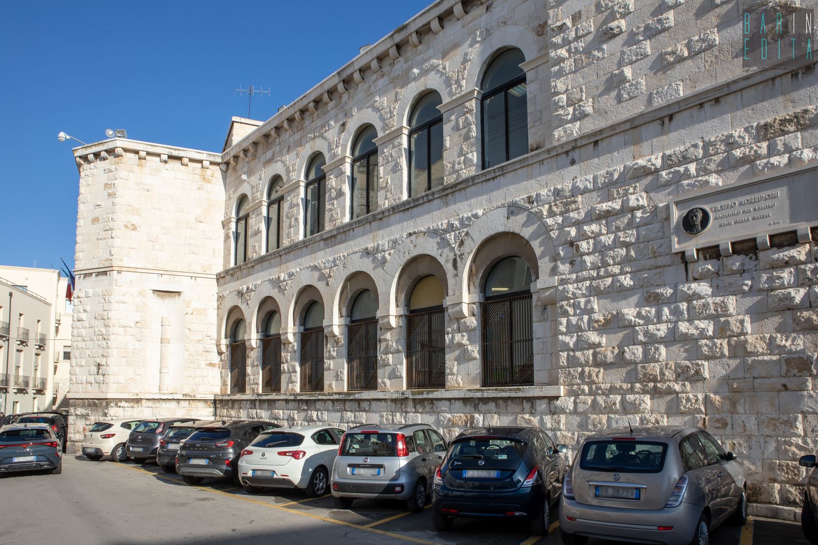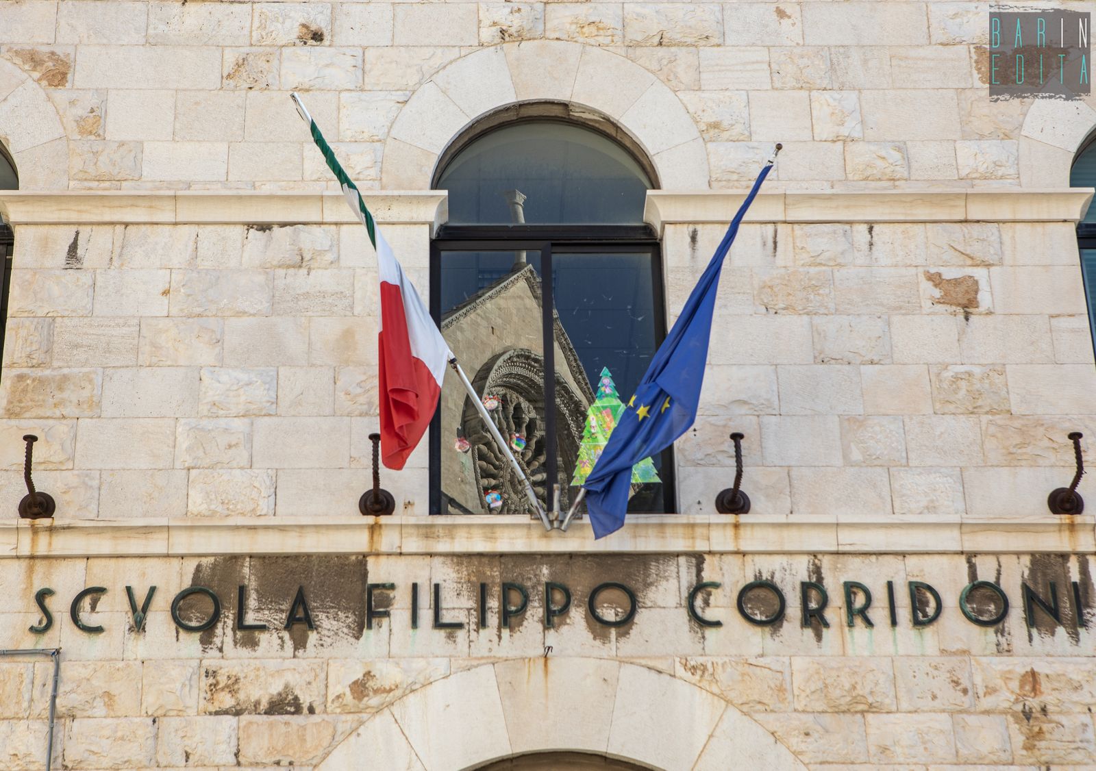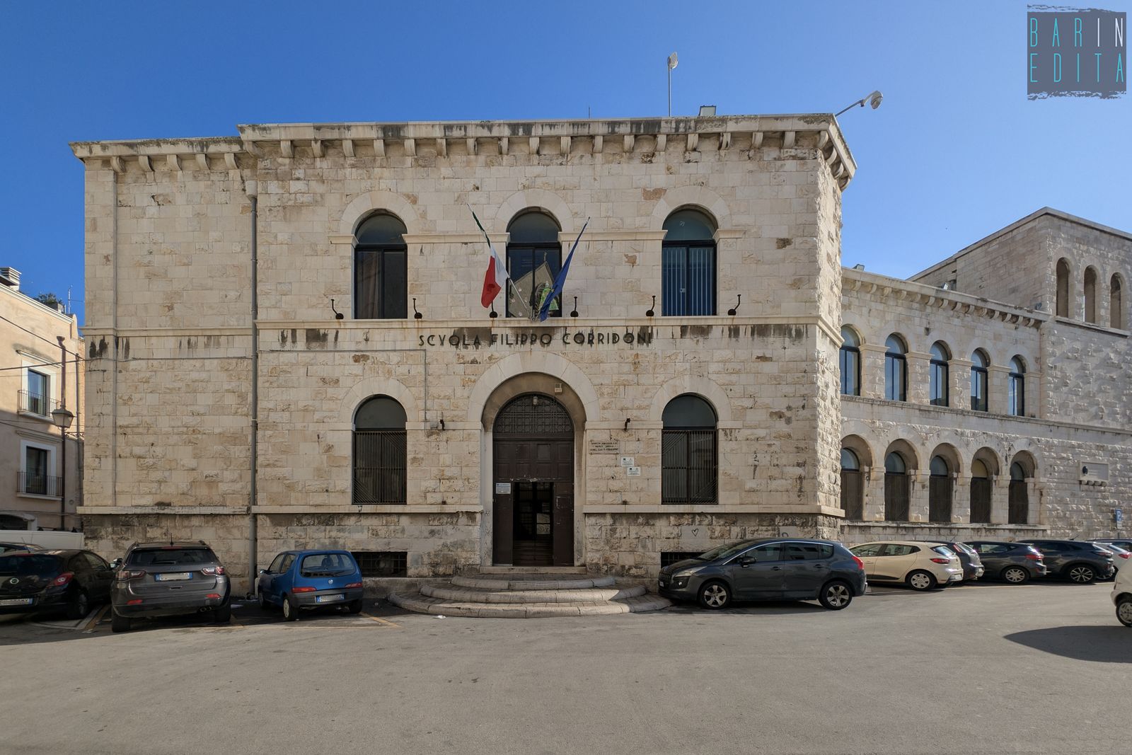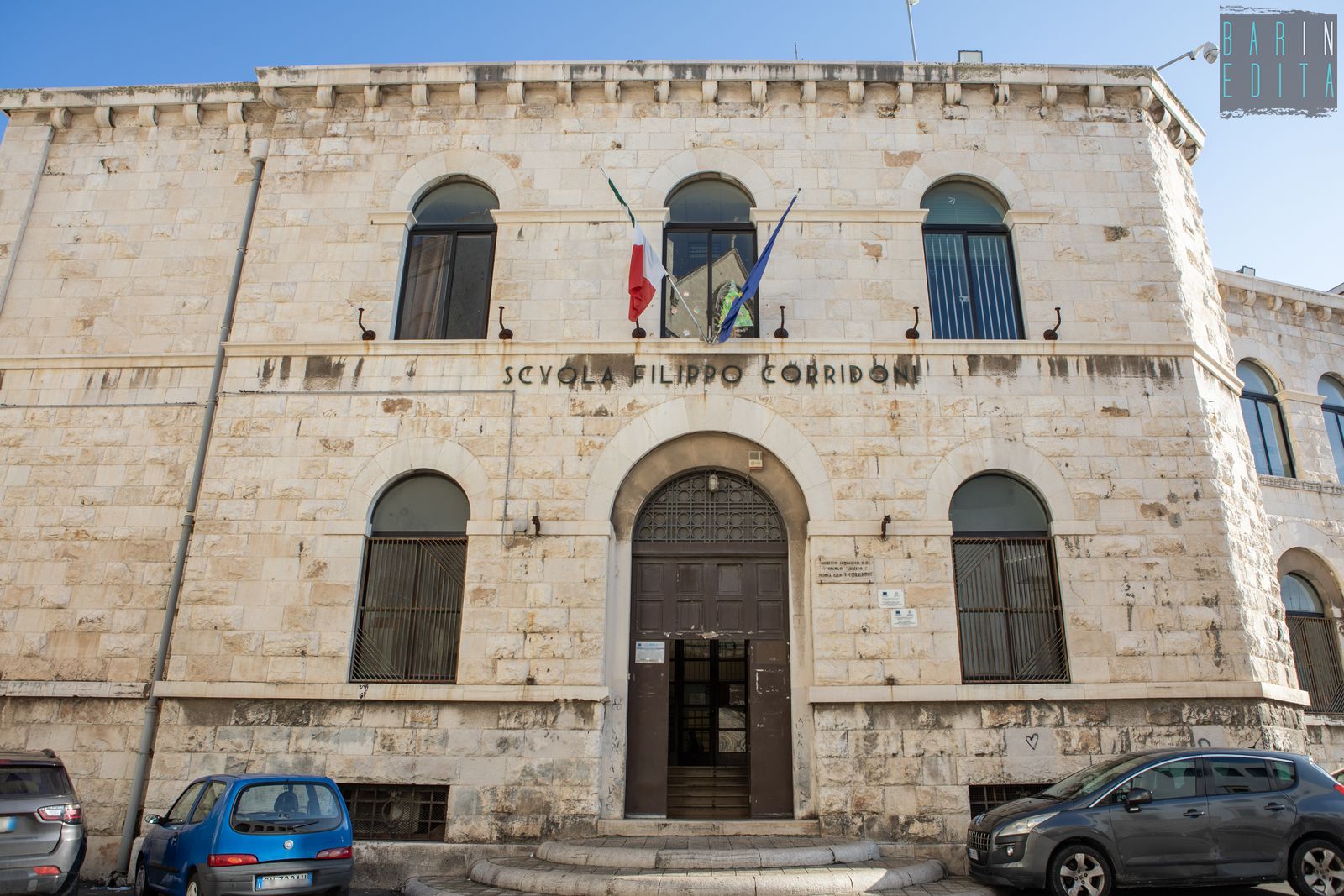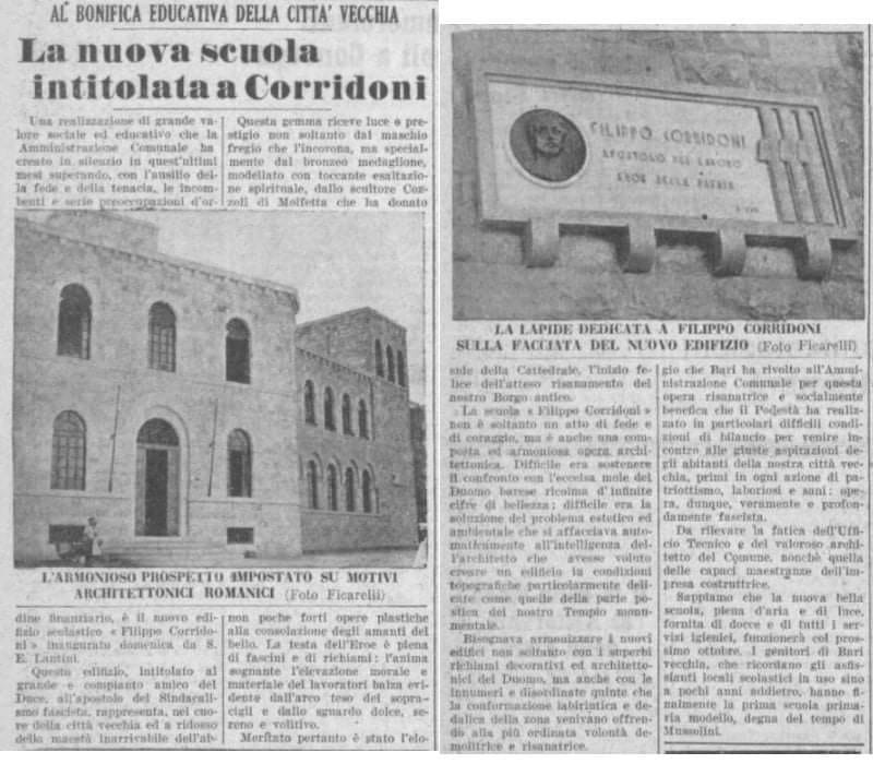 Un vero e proprio simbolo di Bari Vecchia, da decenni punto di riferimento per un’intera comunità. È la descrizione della scuola Filippo Corridoni, istituto del 1939 che ha visto passare tra le sue aule migliaia di bambini residenti nel centro storico. L’edificio sorge in largo San Sabino, alle spalle dell’omonima Cattedrale e conserva ancora oggi, oltre all’austera facciata e al torrino ad archi, anche rari dipinti murali di epoca fascista e un ricco archivio storico.