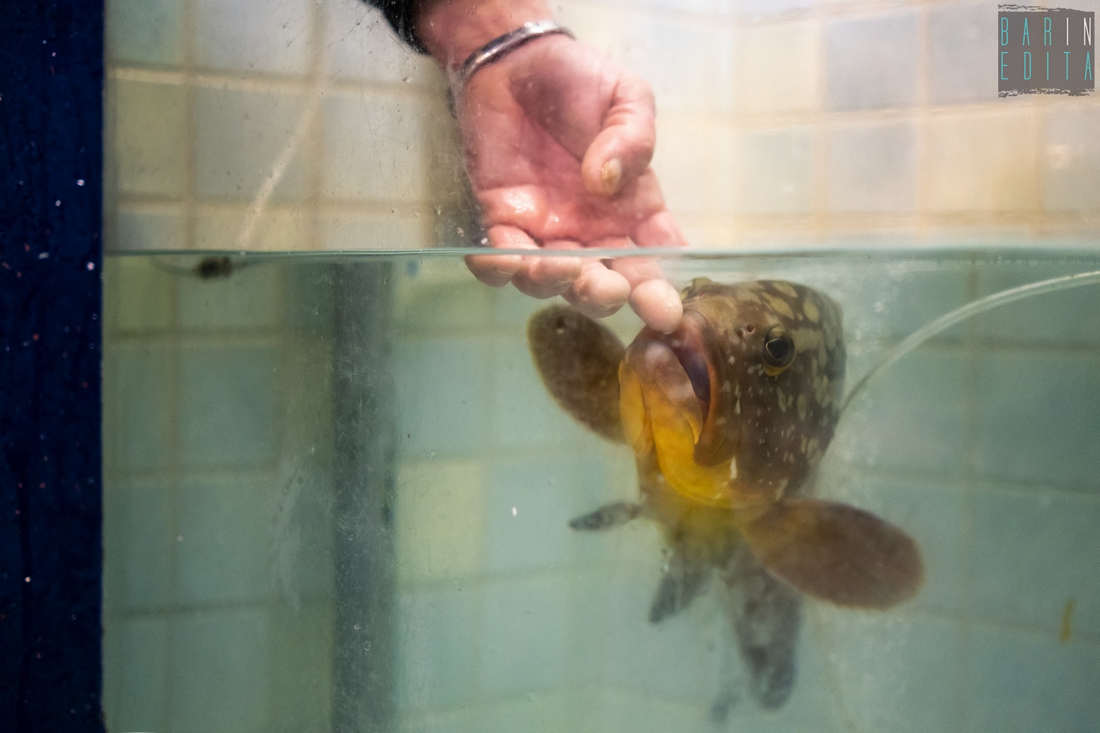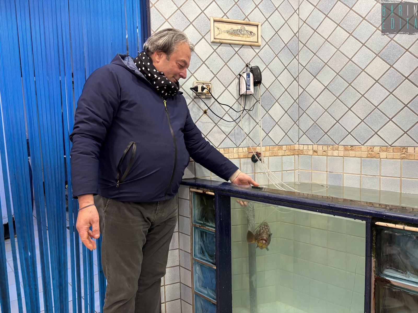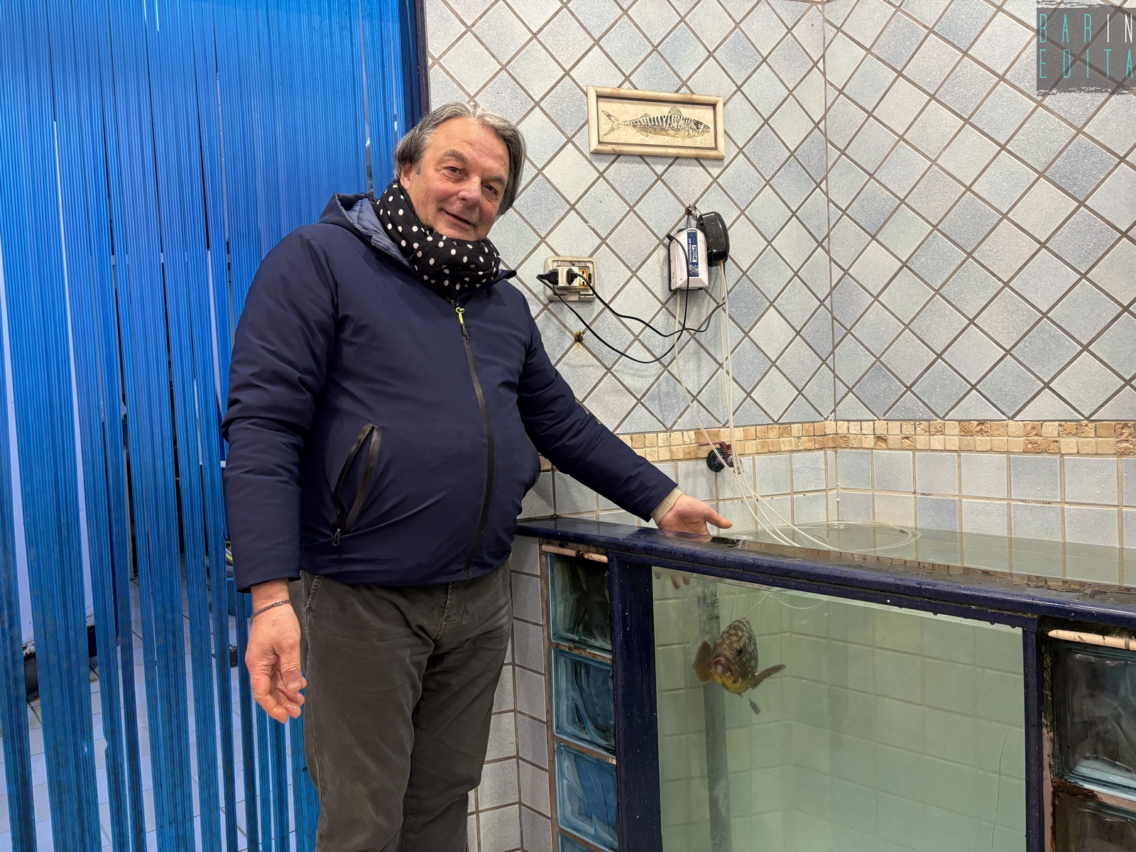 A raccontarci di questo strano legame è il 63enne Natale Caricola, detto Lino, che da due anni e mezzo cura come un animale domestico l’adorata Elena. Lo incontriamo nella sua pescheria Adriatica, in via Fanelli, lì dove alla cernia è stata riservata una vasca tutta sua: ampia e con i vetri azzurri (foto di Rafael La Perna)