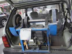 Due scatti che riprendono l'arrotino Sandro e il suo strumento di lavoro: la mola abrasiva