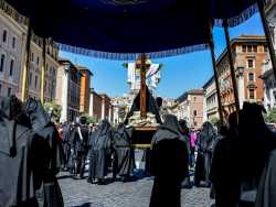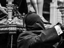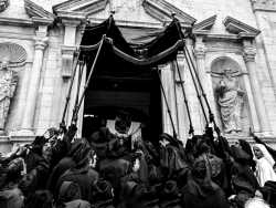 L'Arciconfraternita della Morte dal Sacco Nero. Delle centinaia di confraternite religiose presenti in Italia, ce n’è una che difficilmente può passare inosservata, dato il suo nome che rimanda al “tristo mietitore”. Si tratta di un gruppo di duemila fedeli che si riuniscono a Molfetta, nella Chiesa del Purgatorio. i membri durante le processioni indossano abiti tutti rigorosamente neri, sono incappucciati e sul petto portano una medaglia che rappresenta un teschio con due ossa incrociate dietro (Foto di Cosmo de Pinto)
