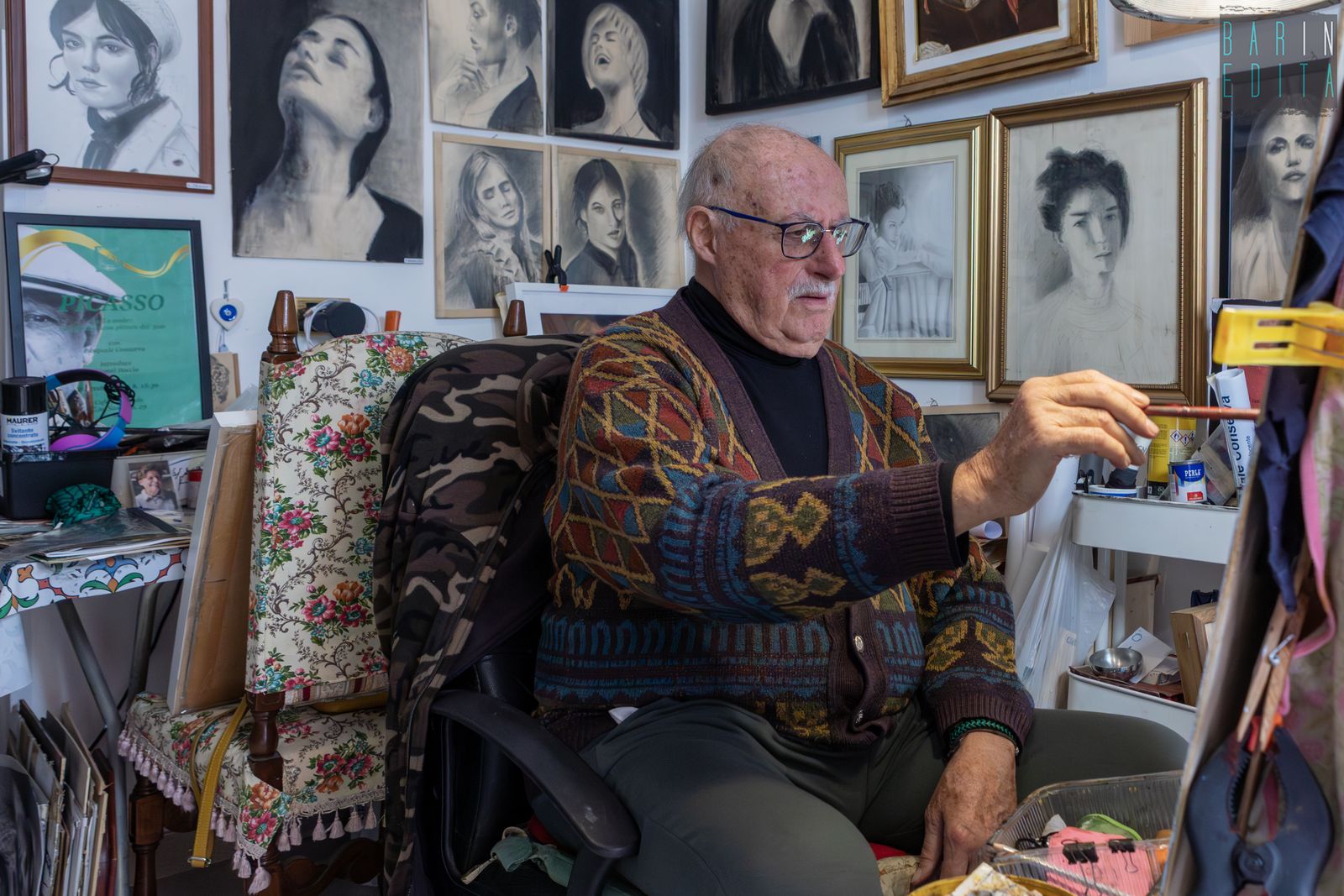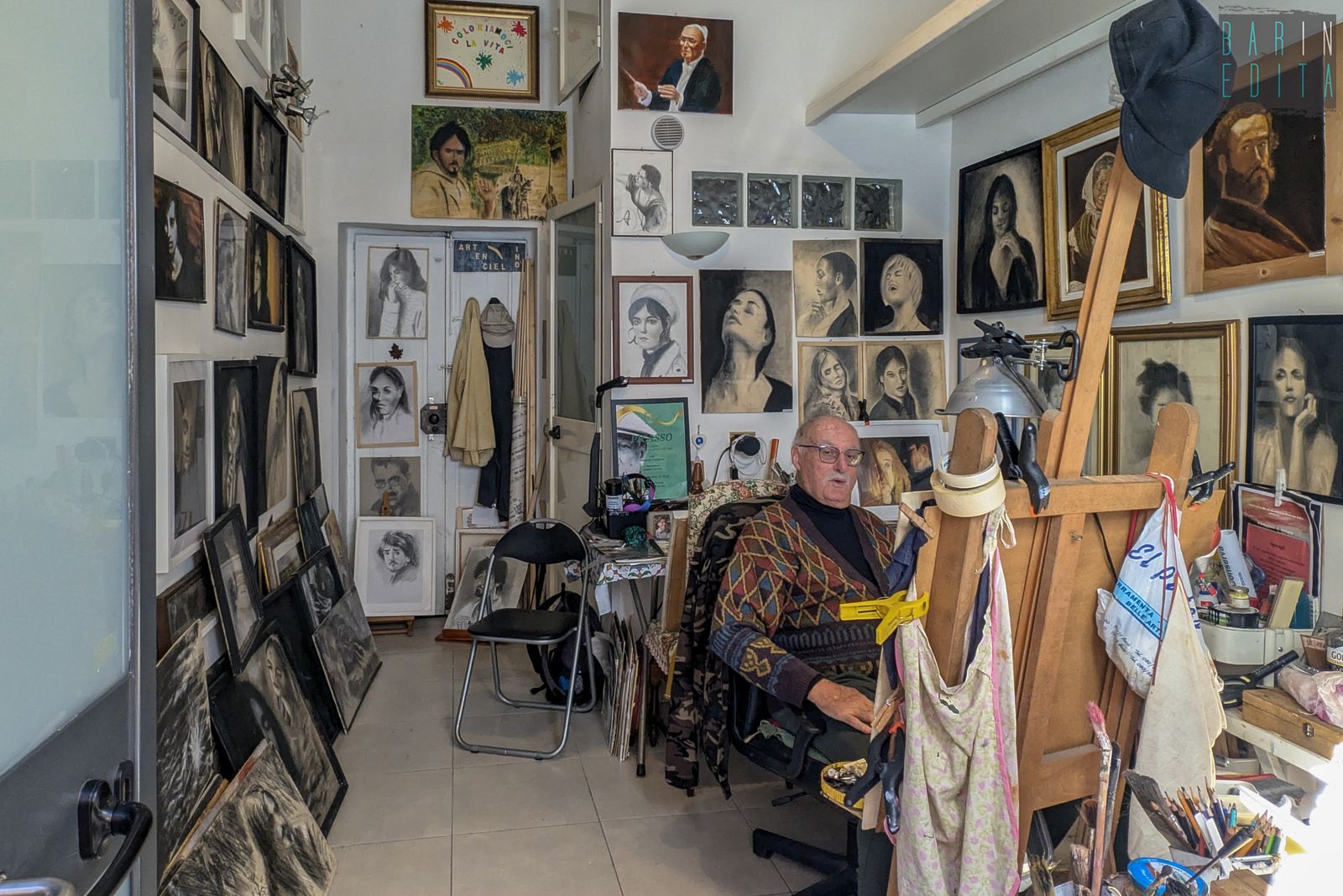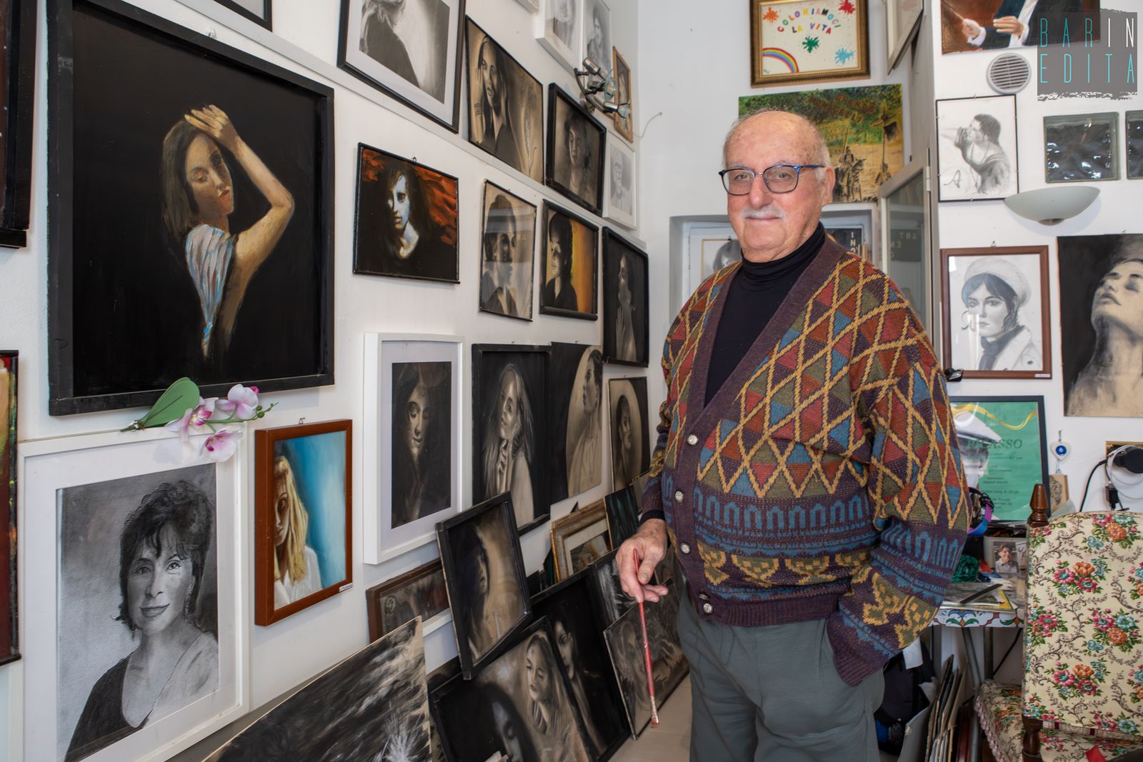 Donne di ogni età, a colori, in bianco e nero, sorridenti o assorte nei loro pensieri. Sono loro le protagoniste indiscusse dei quadri dell’83enne barese Pasquale Conserva: un professore di matematica che, una volta andato in pensione, ha scoperto l’amore per la ritrattistica. Lui infatti da venticinque anni a questa parte si rifugia nel suo piccolo atelier nel rione Madonnella per dipingere volti, più che altro femminili.