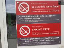 “Il Policlinico di Bari è un ospedale senza fumo: è vietato fumare in tutto l'ospedale (aree interne ed esterne). Può costarti fino a 550 euro”. Sono queste le frasi che campeggiano sui numerosi cartelli “no smoking” sparsi per il Policlinico, il principale nosocomio del capoluogo pugliese. La cosa strana però è che il nosocomio continua a essere pieno di posacenere. Ce ne sono ovunque, spesso posti proprio vicino ai divieti e all’entrata dei reparti. L’”incentivo” causato della presenza dei posacenere, unito all’assenza di controlli, sta quindi portando alla completa elusione della norma