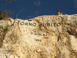 “Torno subito”: due parole che risuonano come una promessa, impresse nella roccia da oltre venticinque anni. In un angolo di Cala Paura, pittoresca insenatura di Polignano a Mare, si trova un’epigrafe nascosta e misteriosa di cui pochi conoscono l’esistenza, nonostante sia posta in uno dei luoghi più famosi del paese a sud del capoluogo (foto di Ilaria Palumbo)