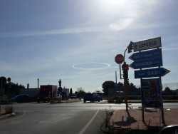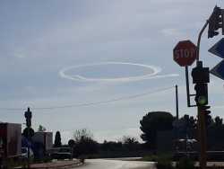 Una grande scia a forma di cerchio nel cielo è visibile da questa mattina da Bari e buona parte della provincia. E' una conseguenza del passaggio di quattro aerei militari Harrier, probabilmente in ricognizione, vista la presenza della nave militare Cavour al largo di Torre a Mare. (Foto e testo di Francesco Savino)