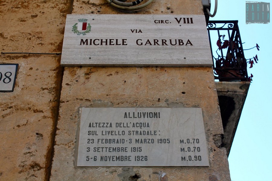 Ci lasciamo alle spalle le case degli alluvionati e ci dirigiamo in via Garruba e via Trevisani. Qui due targhe di recente fattura ci ricordano ancora una volta le disastrose alluvioni del 1905, 1915 e 1926, con segnata accanto persino l'altezza dell'acqua sul livello stradale. Sulla prima sono indicati rispettivamente in metri 0,70, 0,70 e 0,90. Sulla seconda invece 0,40, 0,52 e 1. Quasi a voler mantenere, intrappolati in quelle mura, i segni indelebili di quei furiosi eventi.Notizia di proprietà della testata giornalistica © Barinedita (vietata la riproduzione)