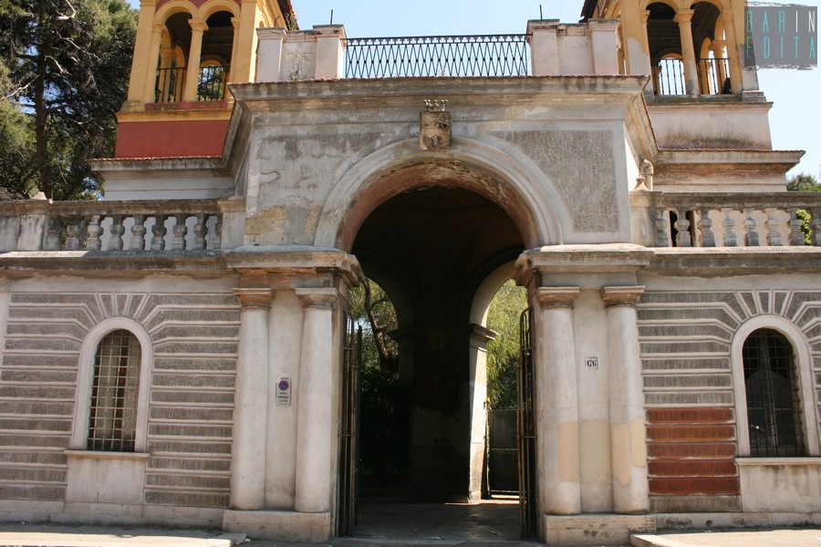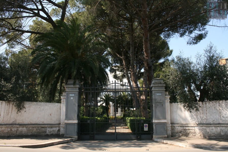 Superato il lungo muro di cinta che separa villa Bonomo dal resto della città, al civico 178, proprio di fronte all’ingresso dell’ospedale pediatrico Giovanni XXIII, troviamo un cancello incastonato fra due colonne bianche, su cui spunta una graziosa lanterna in ferro battuto (foto 6). Le sbarre del cancello sono coperte da una fittissima rete da cui riusciamo comunque a intravedere un breve sentiero alberato che conduce a una residenza di un delicato color ocra, al cui centro spicca un portone timpanato (foto 6b).Notizia di proprietà della testata giornalistica © Barinedita (vietata la riproduzione)