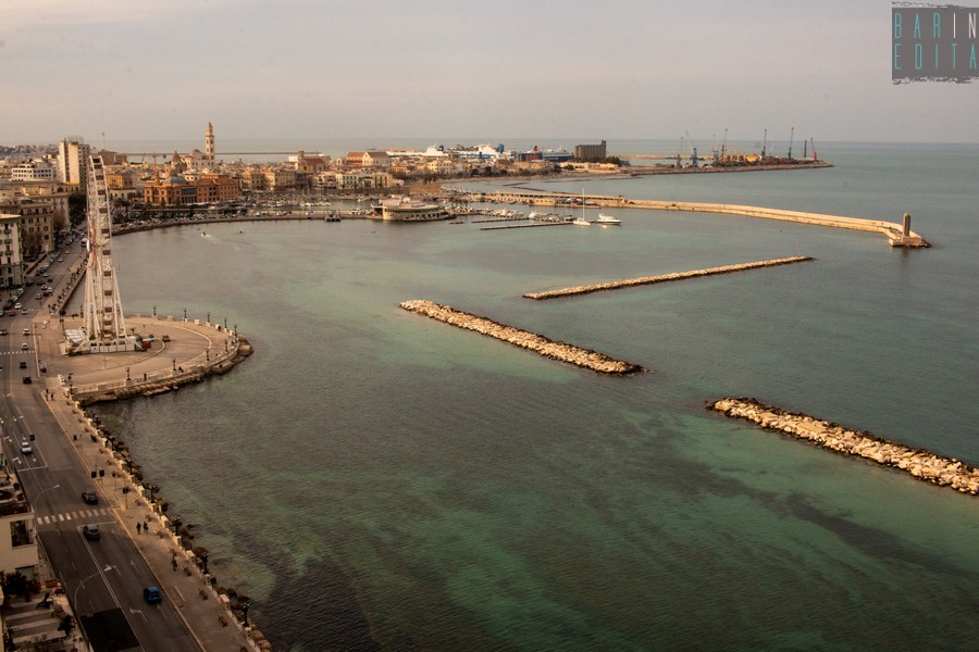 Ma ciò che rende veramente speciale questo luogo è il panorama che si proietta davanti a noi, togliendoci il fiato (25). Ecco la ruota panoramica, il teatro Margherita, il Molo San Nicola, la Basilica e soprattutto la Cattedrale con il suo campanile che domina su Bari vecchia. Da qui si riesce anche a intravedere il Faro di San Cataldo (26)
