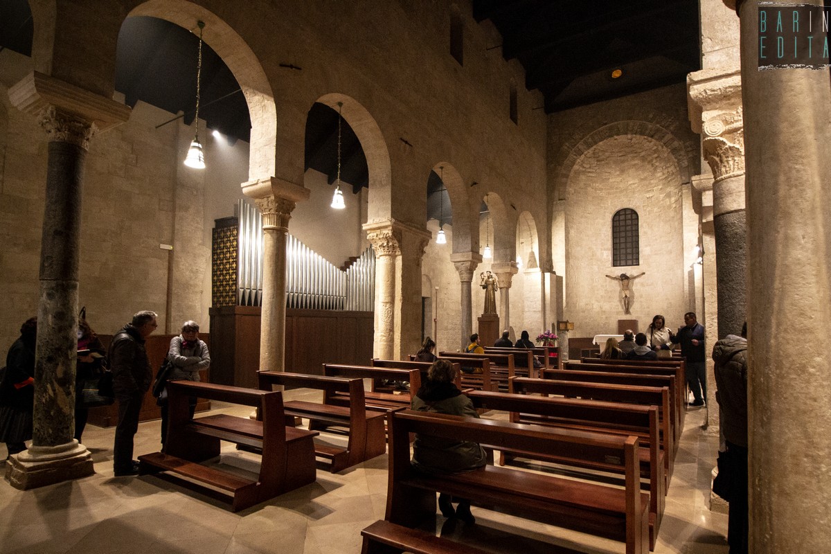 Non resta ora che entrare. Varchiamo l'accesso, ritrovandoci in un ambiente a tre navate, divise da due file di otto colonne per lato. Tutto lo spazio, immerso in una calda luce soffusa, è dominato da arcate e capitelli di reimpiego magistralmente scolpiti: riportano indietro al dominio bizantino della città. All’interno l’odore di pittura fresca misto ad incenso pervade le nostre narici.Notizia di proprietà della testata giornalistica © Barinedita (vietata la riproduzione)