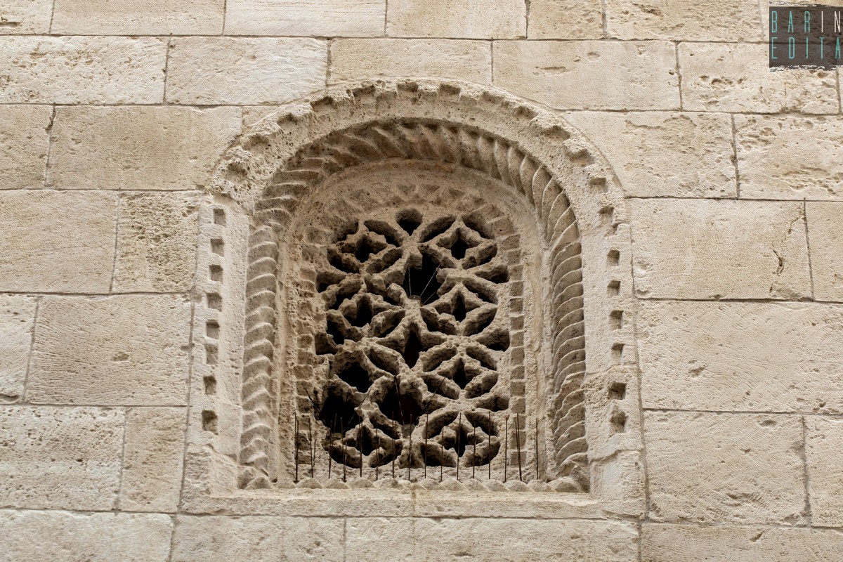 Sollevando lo sguardo, al di sopra delle tre finestrelle abbellite tutt’intorno da grani di rosario, la nostra attenzione è catturata dal timpano triangolare. Racchiuso da un grande arco che include due coppie di piccole bifore, stupisce per le grottesche figure di animali che lo incorniciano. La facciata è conclusa lateralmente da due aperture rettangolari ormai murate e sormontate anch’esse da due monofore transennate.Notizia di proprietà della testata giornalistica © Barinedita (vietata la riproduzione)