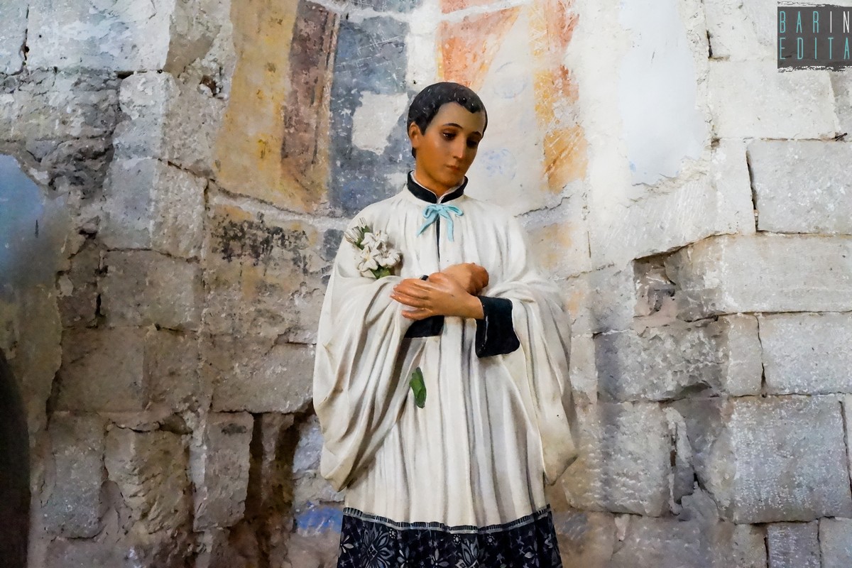 Di fronte a noi osserviamo una delle decorazioni sopravvissute: una statua di Santa Lucia posta su un altare in marmo, racchiusa in una nicchia in pietra e circondata da cornicette in legno con le tappe della Via crucis. Nel secolo scorso infatti qui vi trovò sede la Confraternita degli angeli, che vi introdusse il culto della santa di Siracusa.