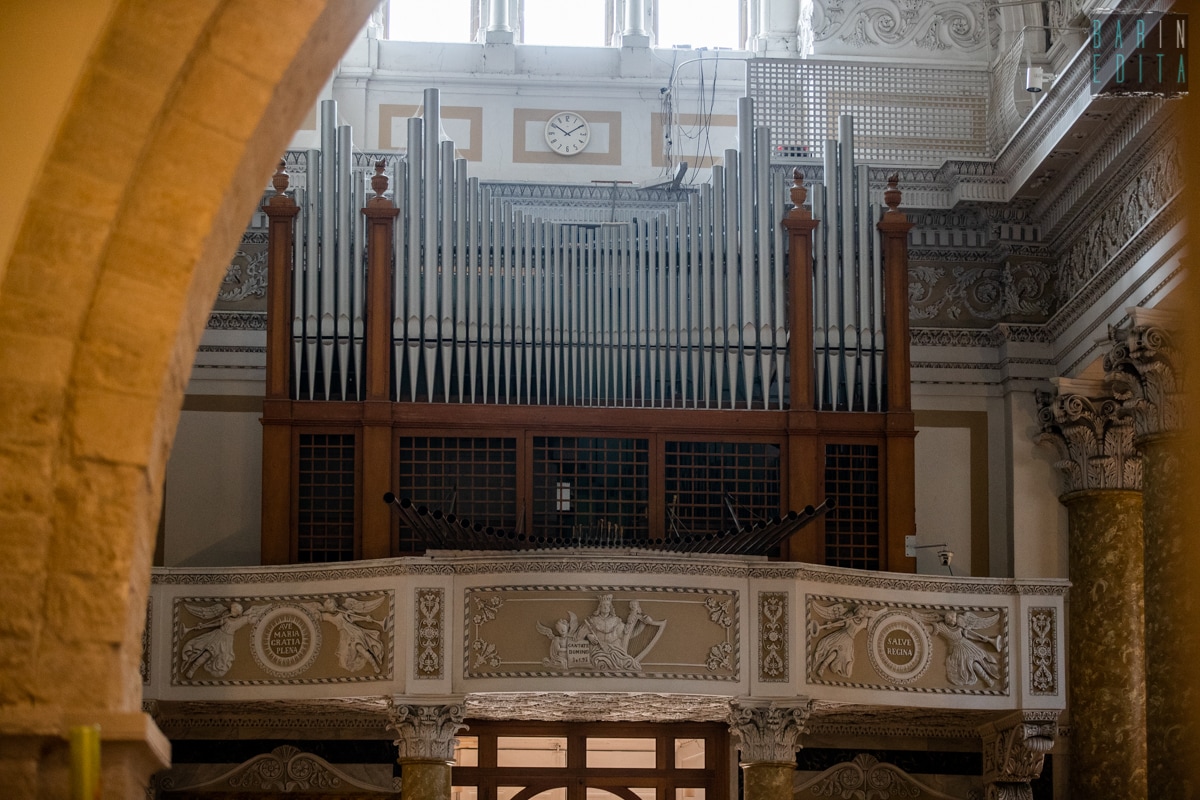 Ma è arrivato ora il momento di entrare nel tempio religioso. L’interno si presenta a tre navate divise da due ordini di colonne corinzie: quella centrale è a tutto sesto, alta, maestosa, decorata a rosoni esagonali incassati e stucchi modulari. Al di sopra della porta d’ingresso, su due colonne, è posizionata la tribuna sulla quale poggia un imponente organo a canne.