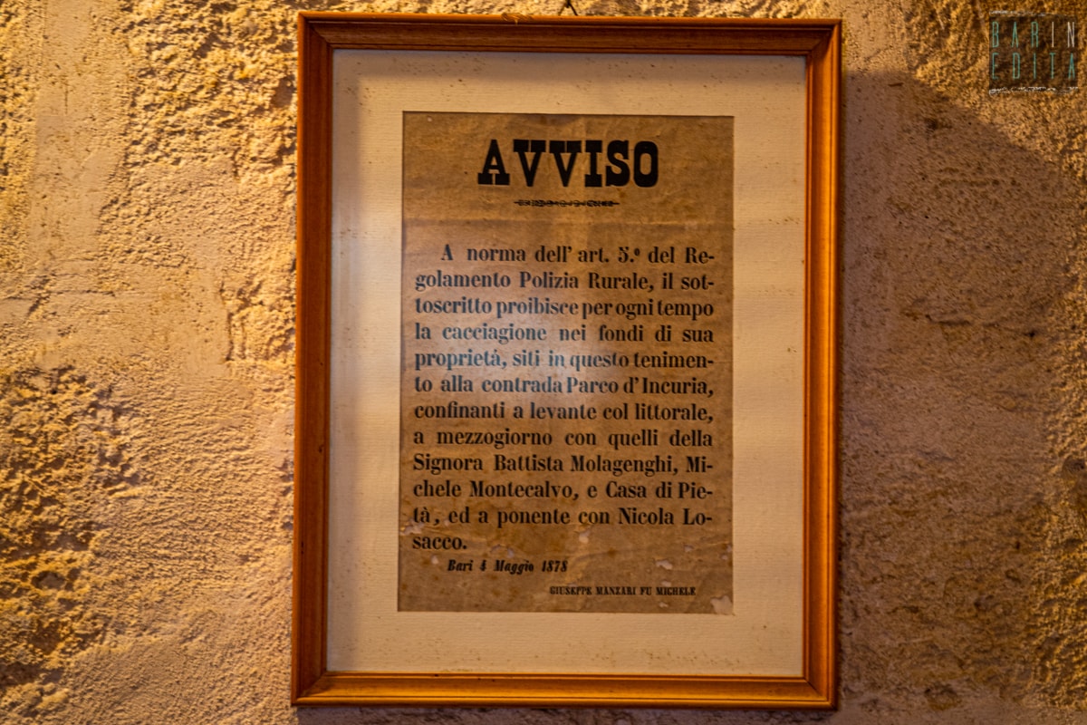 Ma è arrivato il momento di entrare. Ad accoglierci è un ambiente fresco coronato da alte volte. Su una parete è incorniciata una pergamena datata 4 maggio 1878: si tratta di un decreto di Giuseppe Manzari che proibisce la caccia nella contrada.
