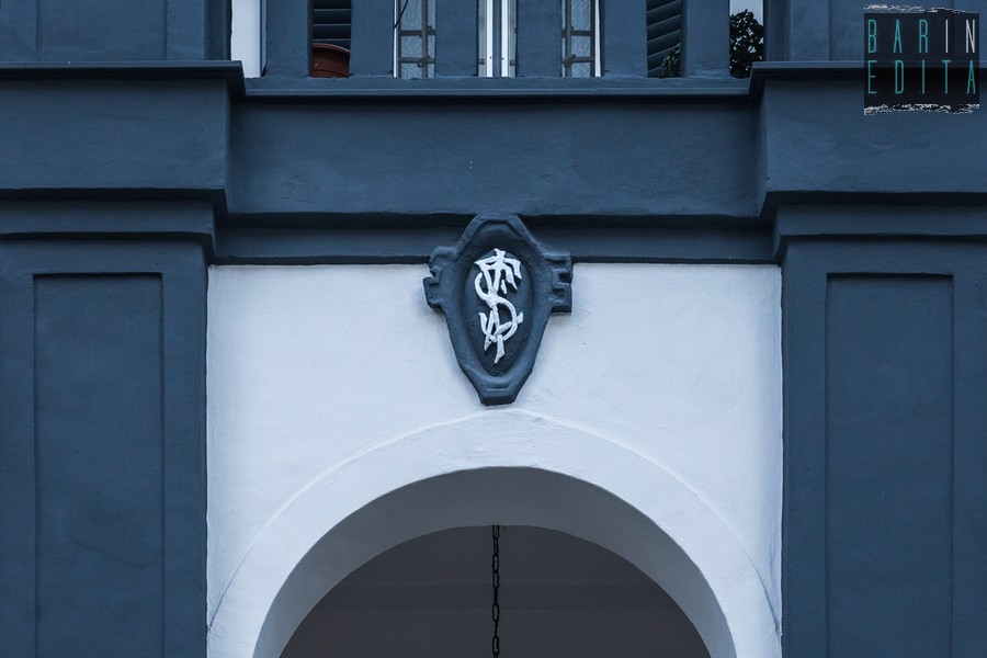 Varchiamo l’ingresso e imbocchiamo un curato viale alberato che ospita due piccole panchine e alti arbusti che fanno da cornice alla dimora recentemente ristrutturata, che trova spazio alla fine del sentiero. La struttura, bianca e grigia, si sviluppa su due livelli (oltre a un piano sotterraneo) e presenta tre aperture ad arco a tutto sesto delimitate da lesene, tra le quali spicca lo stemma di famiglia: un ovale grigio sul quale si intersecano a caratteri bianchi una F, una S e una L.