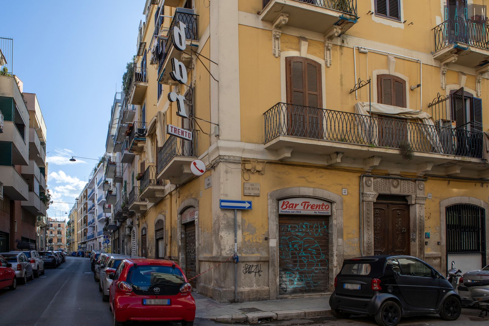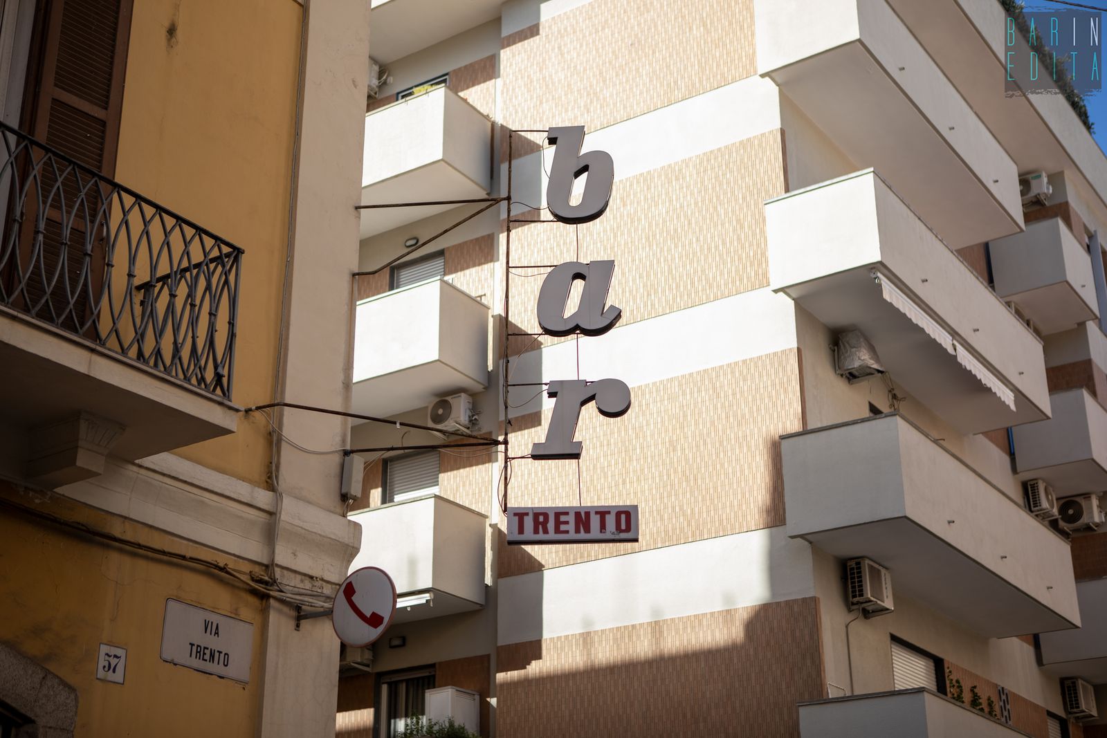 Ci spostiamo ora in un’altra zona di Bari, nel quartiere San Pasquale, dove in via Trento ad angolo con via De Nittis spicca l’insegna verticale del Bar Trento. È affiancata dal simbolo del telefono, tipico degli esercizi commerciali che un tempo, quando non esistevano ancora i cellulari, ospitavano un telefono pubblico.
