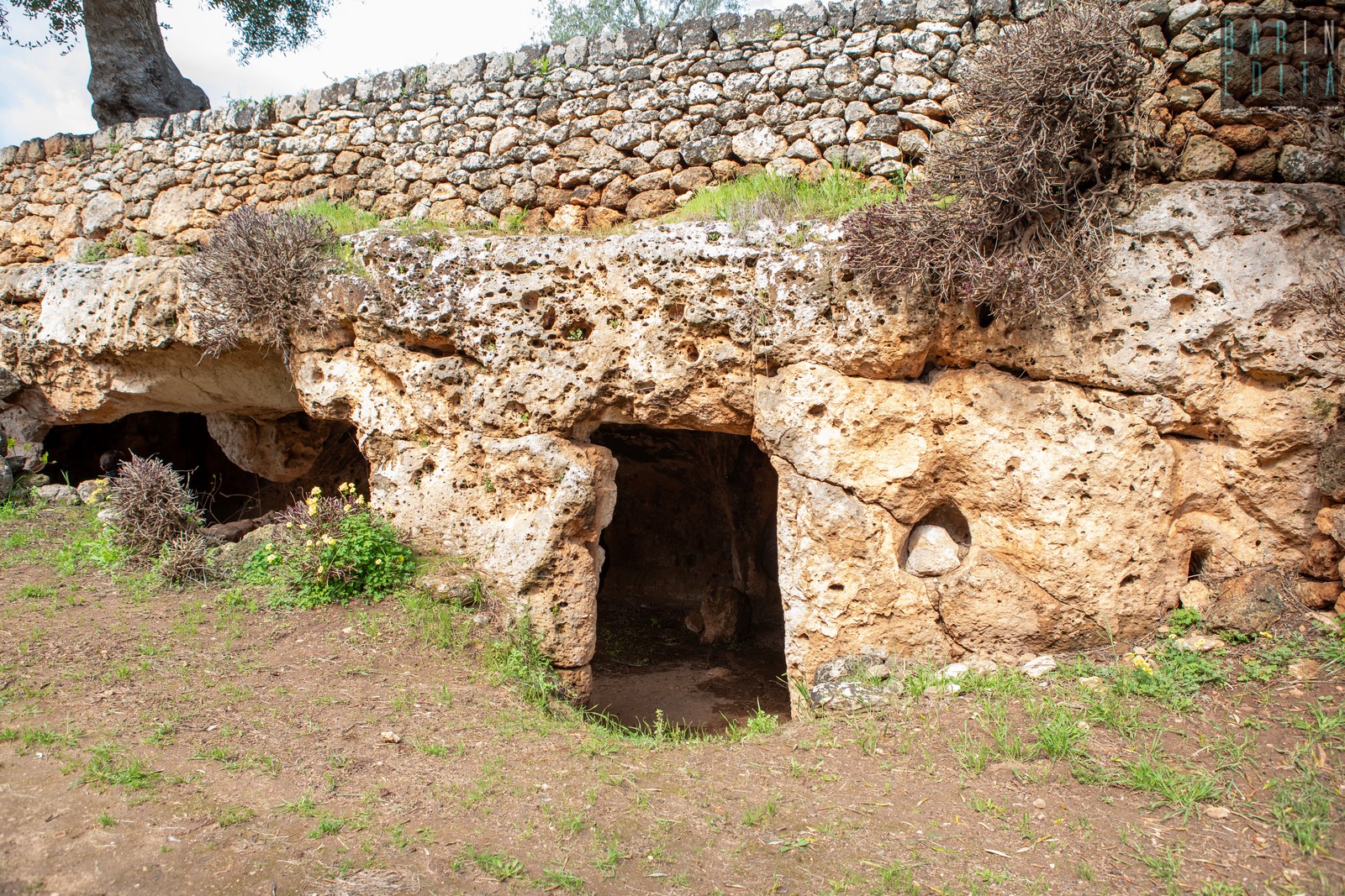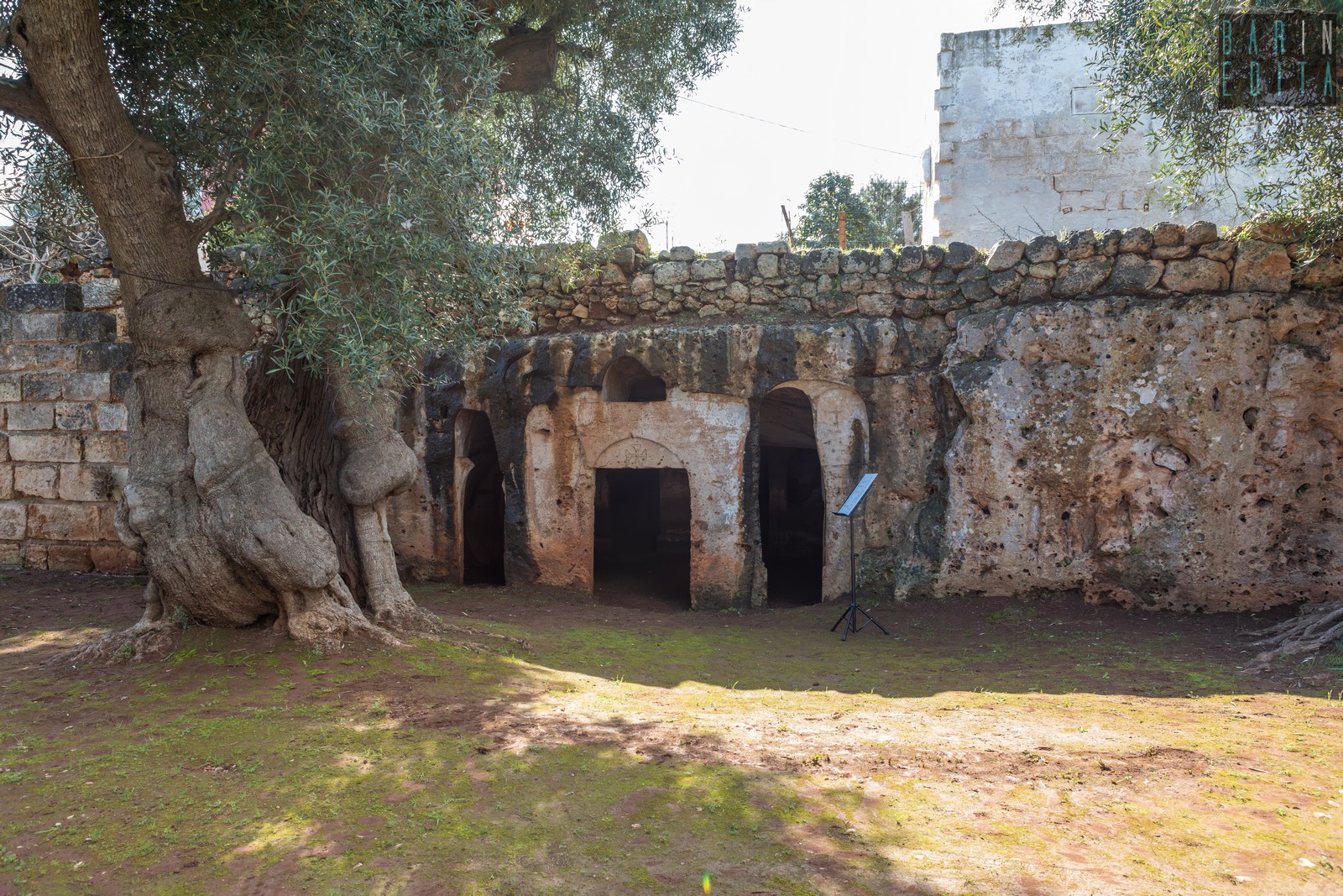 Torniamo all’esterno e ci spostiamo sul lato occidentale della lama dove, sotto ulivi e muretti a secco, si celano altre 13 grotte, disposte ai lati di un sentiero sterrato, utilizzate dagli abitanti del villaggio come laboratori agricoli e abitazioni. Alcune hanno conservato l’originario accesso scavato nella roccia altre invece sono chiuse da murature in tufo con arcate, finestre, nicchie e ganci per gli animali, realizzati in epoche successive.