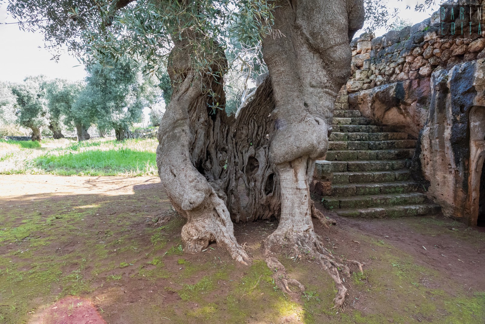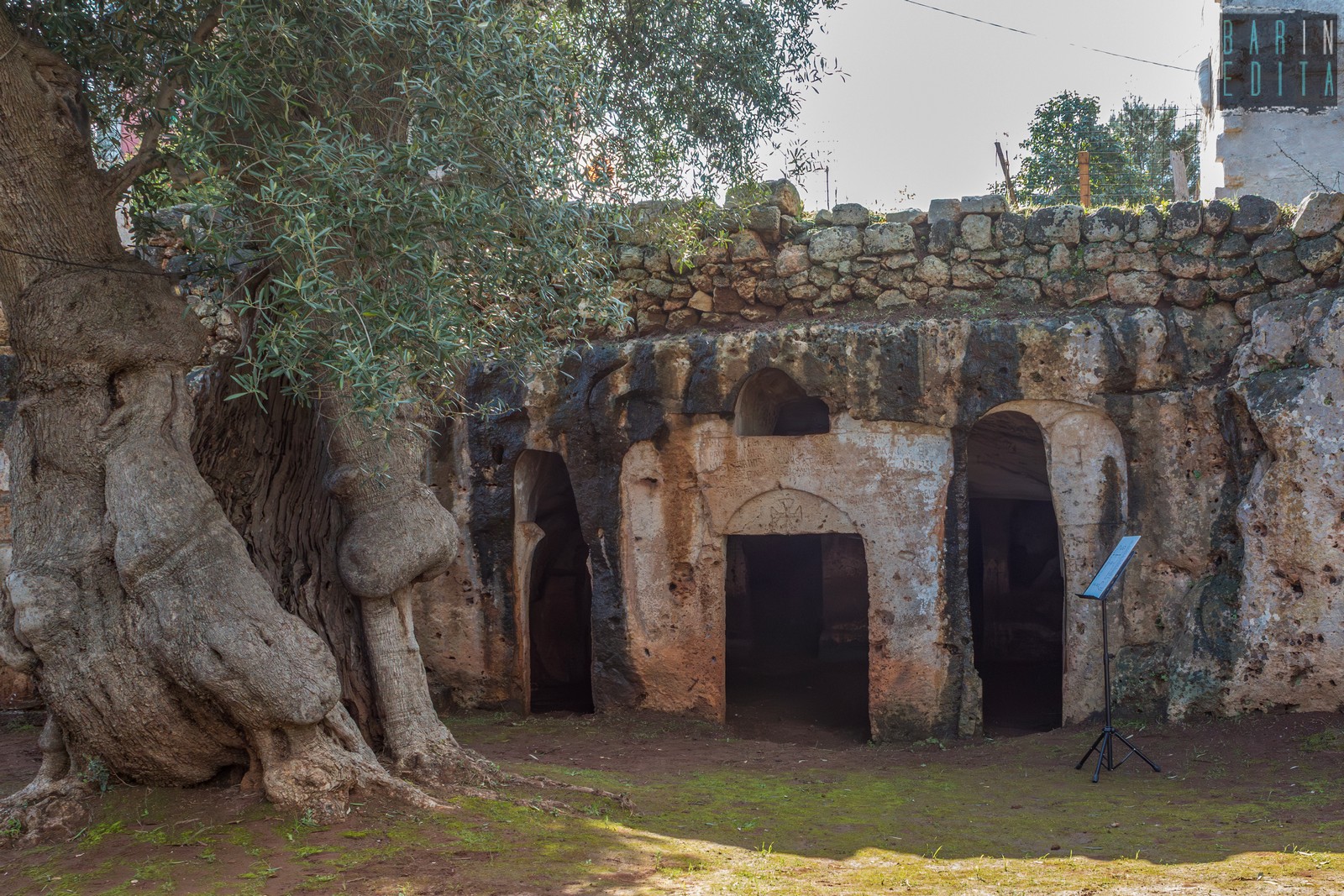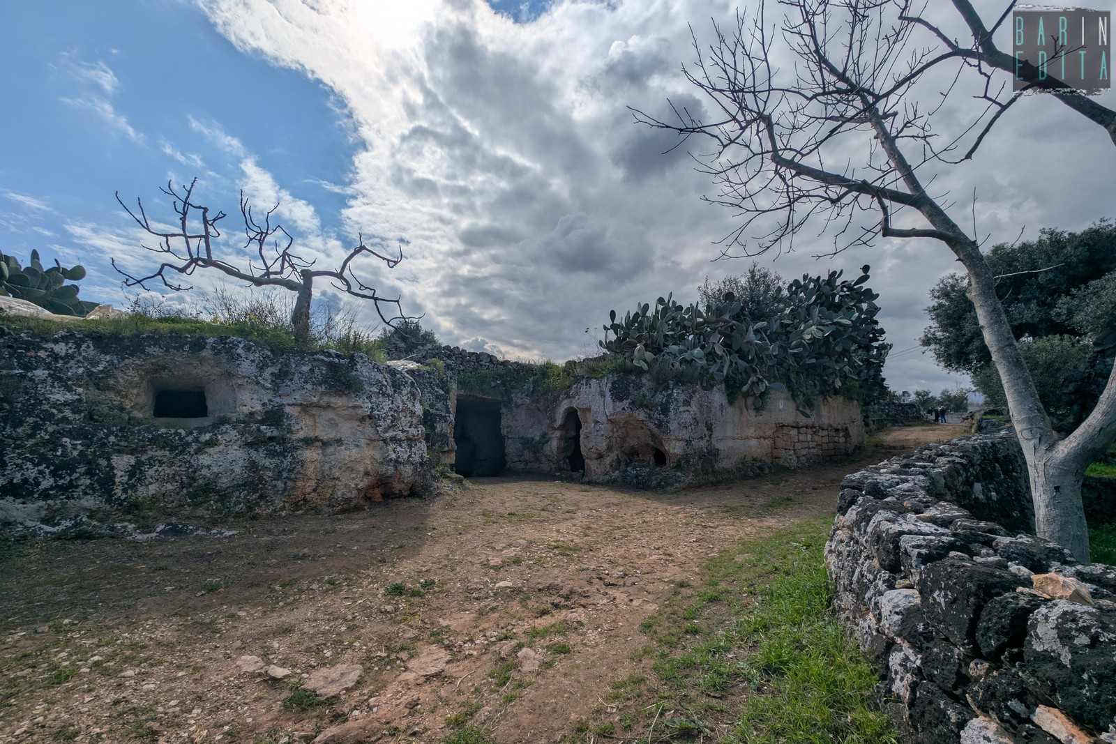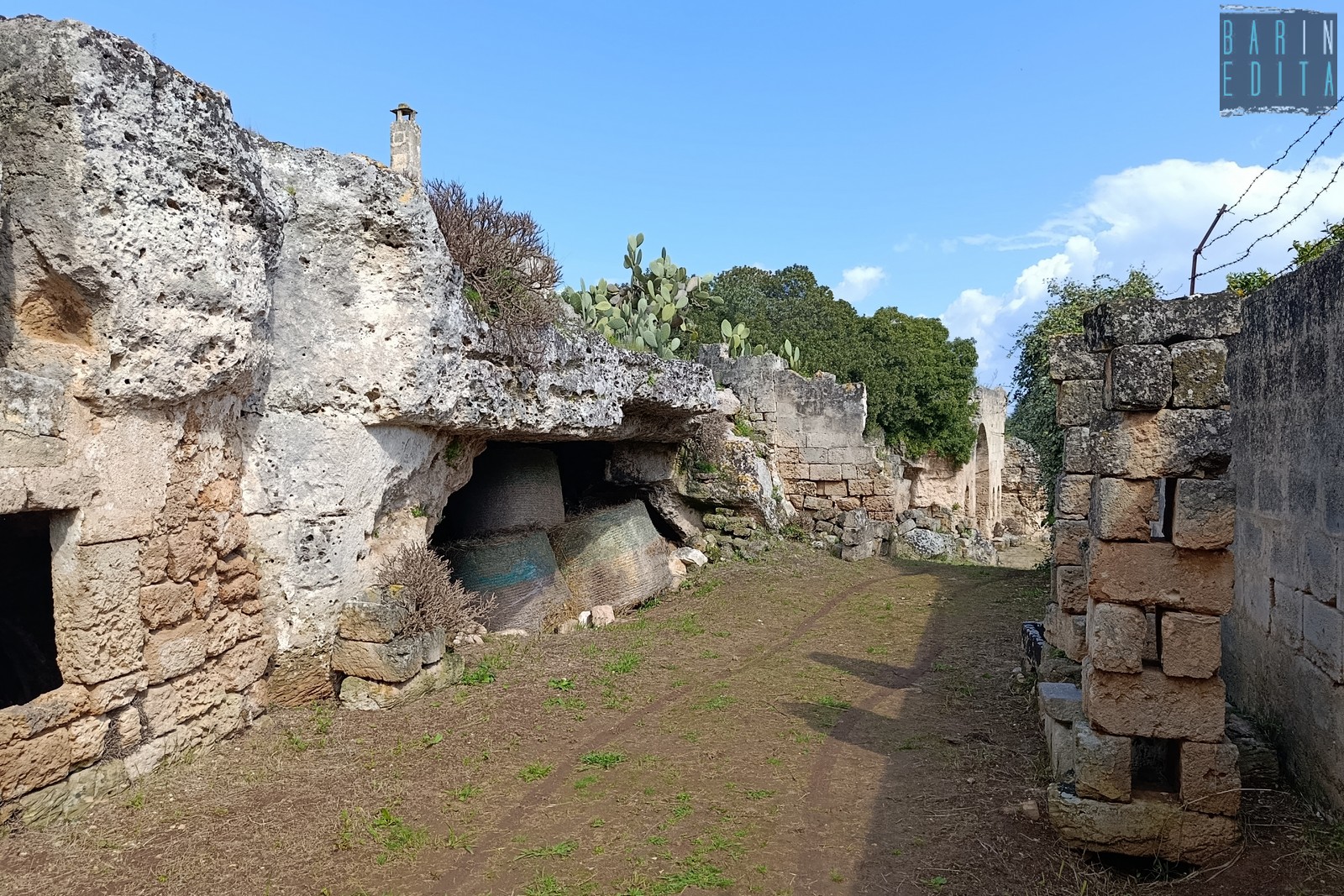 Superiamo l’edificio e, tramite una scaletta in pietra, scendiamo nell’adiacente lama, dominata da rigogliosi ulivi, le cui fronde fanno ombra alle tante grotte che compongono il villaggio. Questi ambienti furono scavati nel banco roccioso probabilmente dai monopolitani rifugiatisi nelle campagne a seguito della distruzione della città nel 1042, durante la guerra tra il catapano bizantino Maniace e l’esercito normanno.