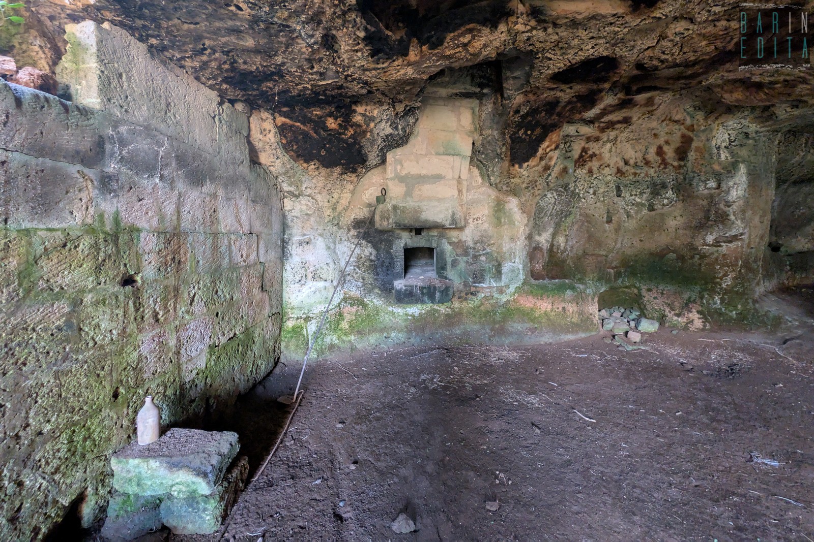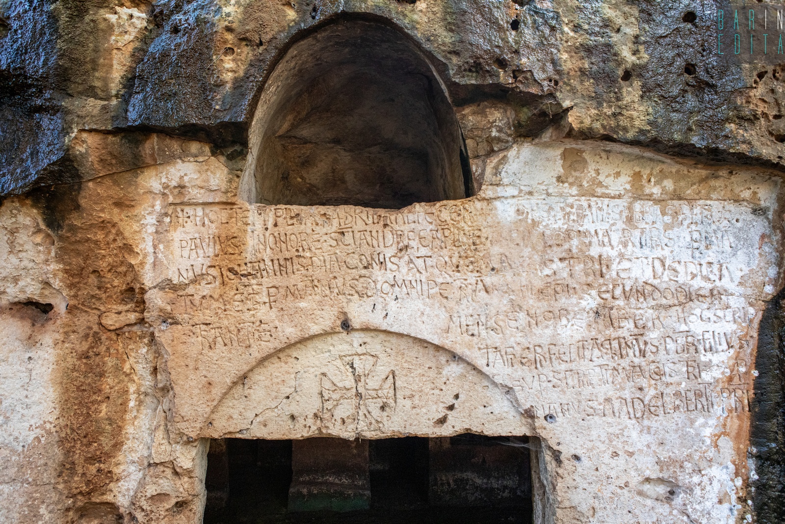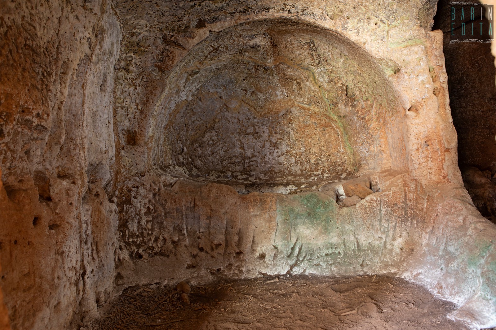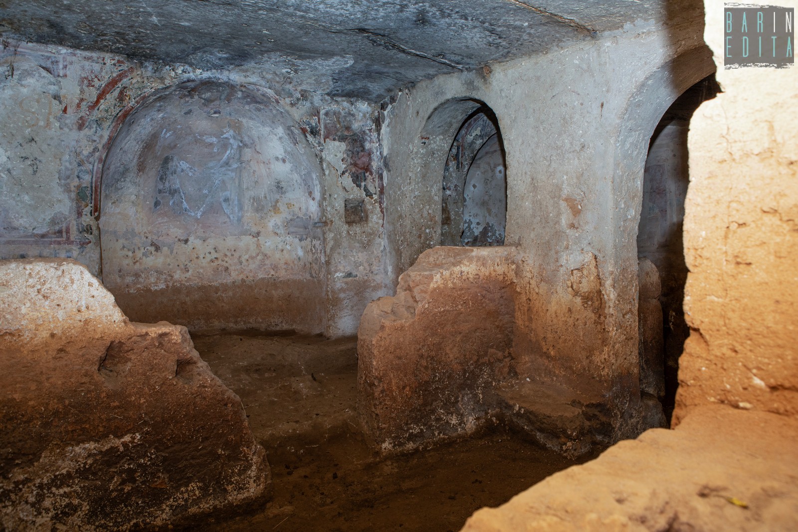 Accediamo all’interno che si compone di un’unica aula quadrata di circa 50 metri quadri, con soffitto piano e pareti articolate da sporgenze e nicchie. Sulla destra notiamo anche uno stretto cunicolo che conduce a un piccolo vano usato anticamente come camera sepolcrale.Notizia di proprietà della testata giornalistica © Barinedita (vietata la riproduzione)