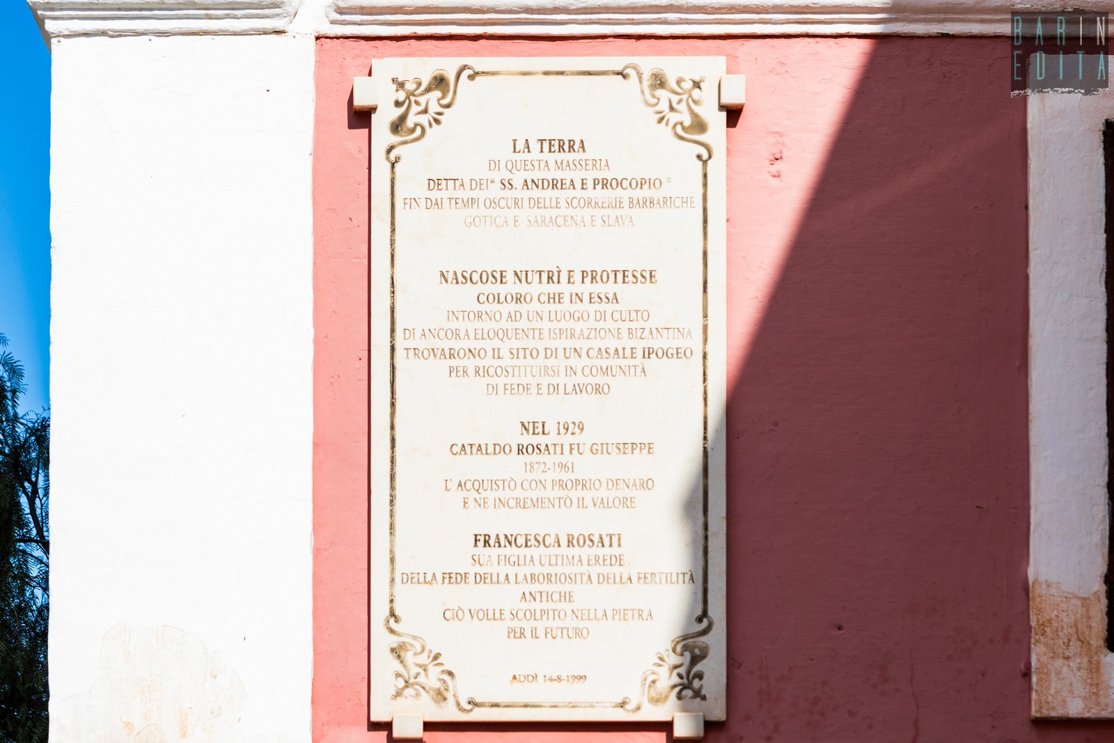 Dopo 200 metri raggiungiamo l’ingresso dell’ottocentesca Masseria Rosati, edificio su due livelli color rosa antico. «Abbiamo ereditato la tenuta da Francesca Rosati, zia nubile di mia moglie – ci spiegano i proprietari Nicolò Pascale e Domenica Semeraro, indicandoci una targa in marmo a lei dedicata -. Fu suo padre a comprarla e restaurarla nel 1929, quando veniva chiamata Masseria dei santi Andrea e Procopio, prendendo il nome della chiesa rupestre qui presente».Notizia di proprietà della testata giornalistica © Barinedita (vietata la riproduzione)