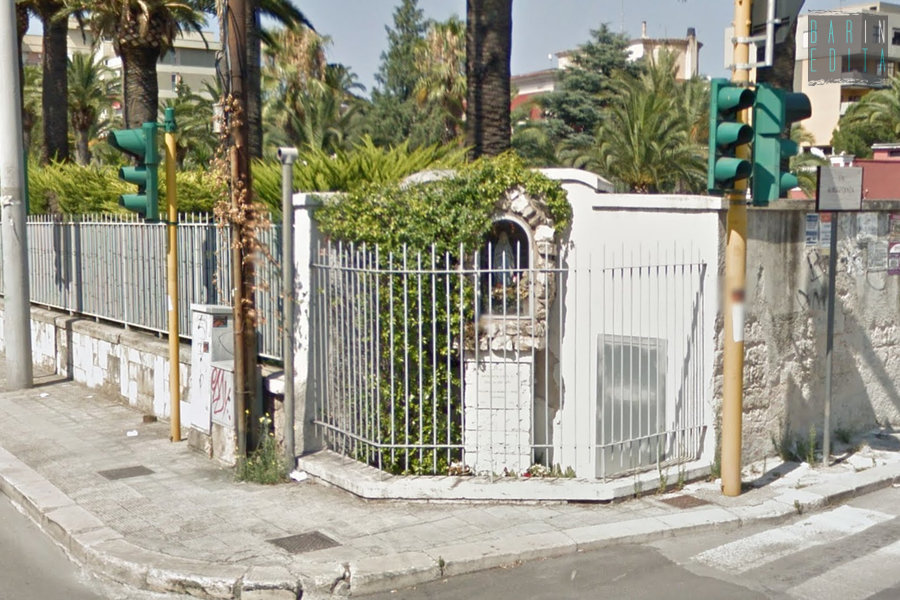 D’altro canto la cancellata appare ora completamente distrutta: è probabile quindi che anche la scultura sia finita in mille pezzi. In alternativa potrebbe essere stata rubata o messa in salvo da qualcuno che vive a villa Alberotanza. L'edicola è infatti incassata nell'angolo della recinzione che circonda l'edificio del 1931, tra la via omonima e corso Alcide de Gasperi. E alla cappellina ci si può accedere solo attraverso una porticina situata all’interno del giardino della villa.Notizia di proprietà della testata giornalistica © Barinedita (vietata la riproduzione)